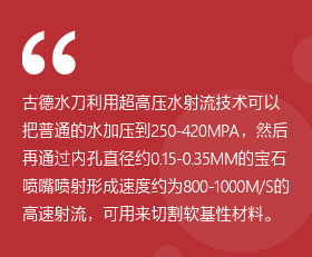 在过去的十多年里,古德水刀在水射流技术领域有着许多激动人心的创新,我们拥有的客户和他们取得的盈利足可证明我们的成长历程。在持续发展的岁月里,我们始终秉持以诚待人务实创新之精神,承诺为您提供世界新、好、先进的水射流技术和设备。我们愿意通过我们的产品质量、管理水平、以及众多的高素质专业技术人员和销售团队的专业服务,成为您可信赖的永久合作伙伴。